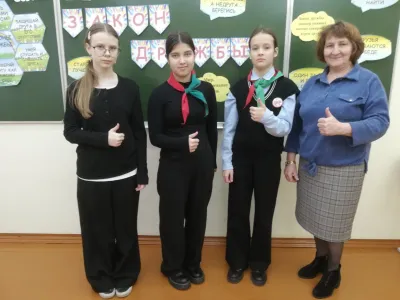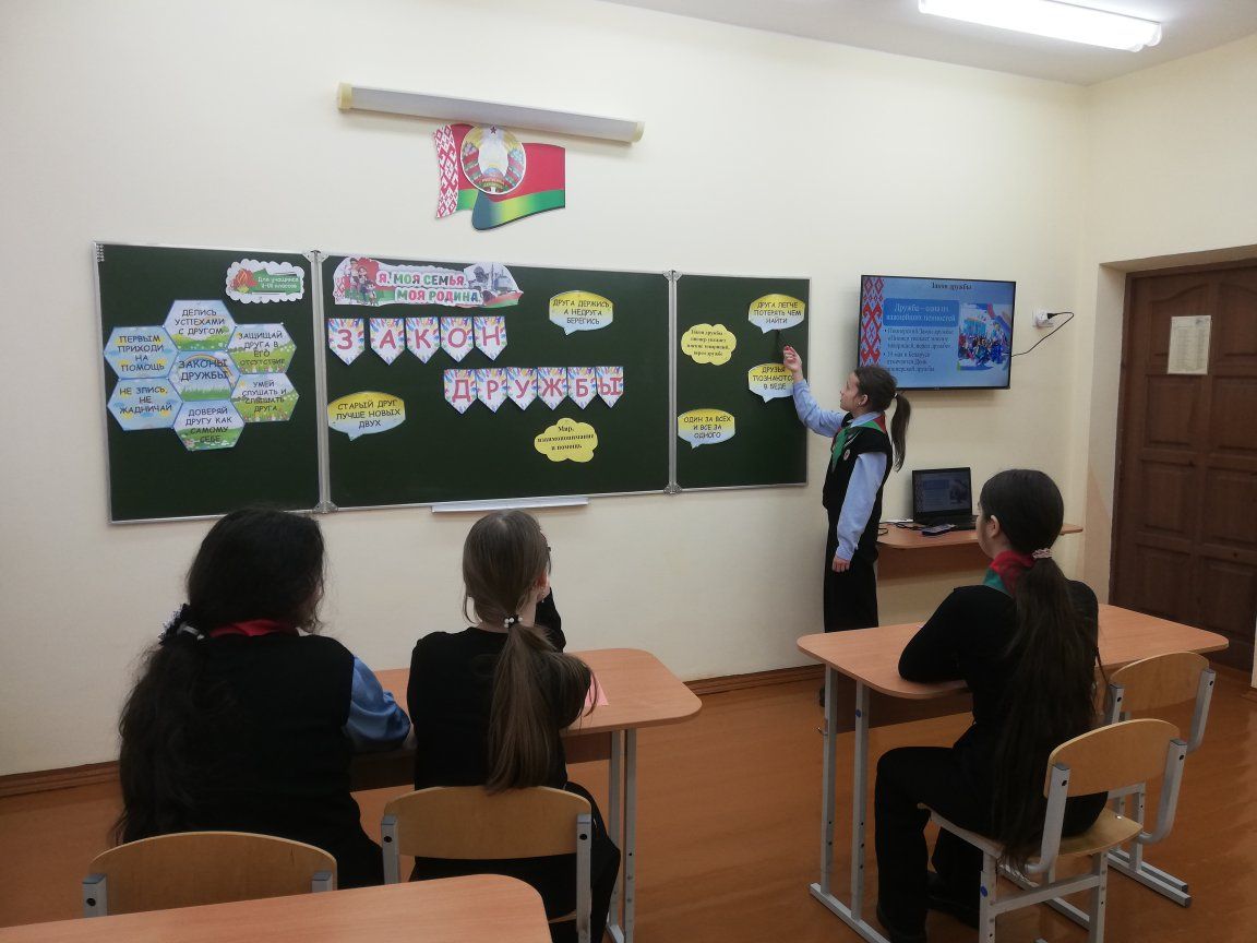 Для учащихся 6 класса был проведен классный час "Закон дружбы" в рамках проекта "Я. Моя семья. Моя Родина". Шестиклассники рассуждали о том, кто такой друг, что такое дружба, что значит: уметь дружить, о важности пионерской дружбы. Затем ребята просмотрели видеофильм "Не трус и не предатель" и ответили на вопросы. Подводя итоги занятия, подростки разработали памятку "Правила дружбы".