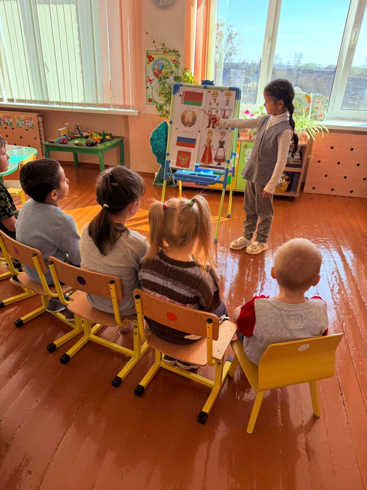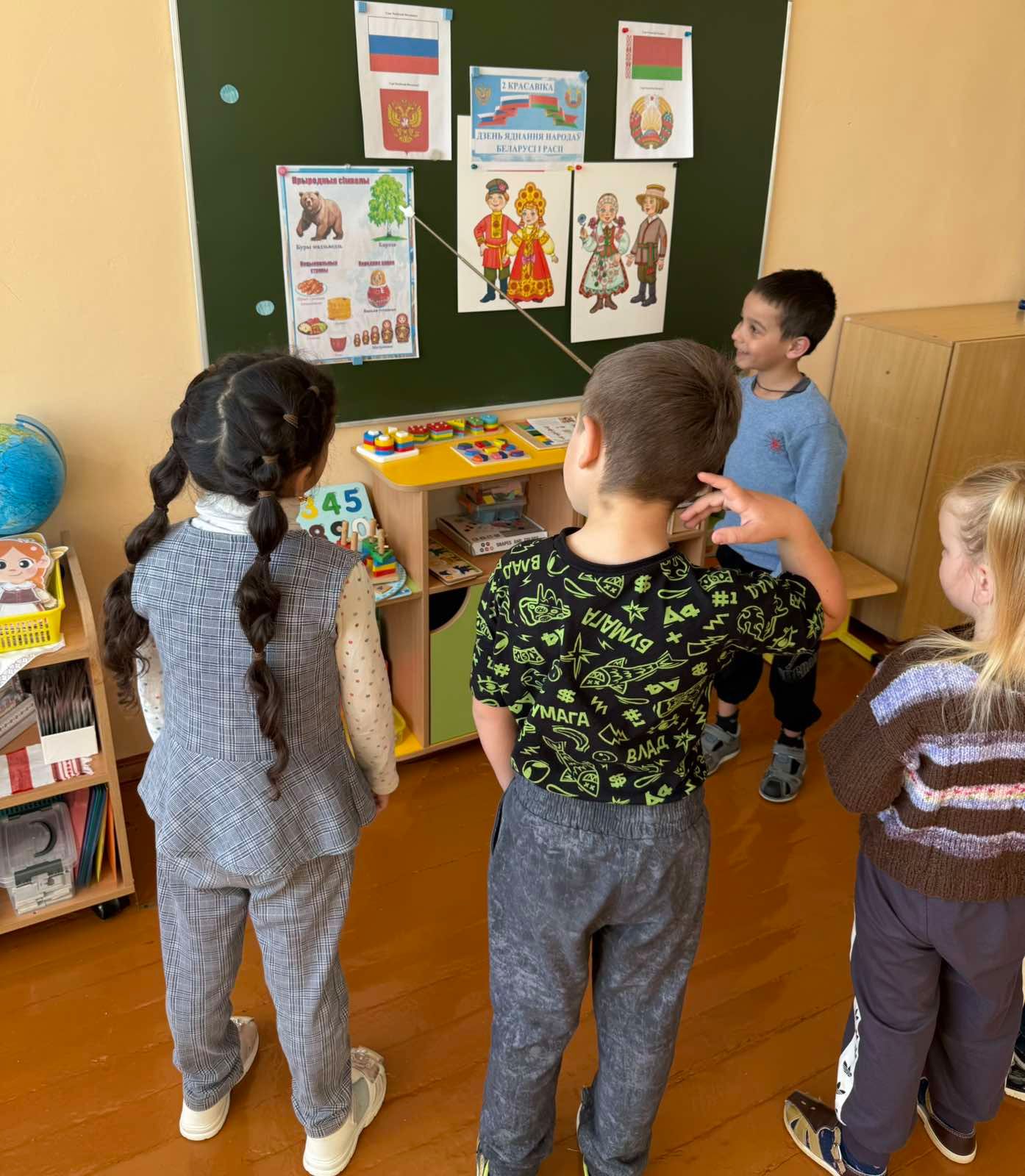 Дети рассматривали гербы и флаги России и Беларуси, сравнивали национальные костюмы, находя в них общие черты и уникальные различия.